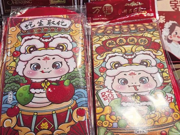 “我们是第一家上新的商铺,今天才刚把货品摆上架子。”一家商铺的老板难掩兴奋之情,滔滔不绝地介绍,“往年,通常都要到腊月才着手进货上新,可今年不同,2025年的春节相对提前了一些,我们也相应地提前了蛇年节庆用品的上新时间。从这几天的销售情况来看,消费者对蛇年元素的接受度还是相当高的,尤其是年轻顾客,他们对这些新颖独特的设计特别感兴趣。”这位老板还兴致勃勃地表示,蛇年元素的商品种类相较于往年有了显著的丰富和拓展。