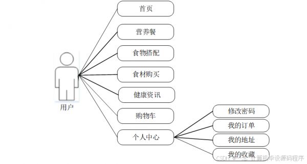 (2)用户可以对营养餐、食物搭配、食材购买、健康资讯、购物车、个人中心(修改密码、我的订单、我的地址、我的收藏)等进行基本的信息管理。用户用例分析如图3-2所示。