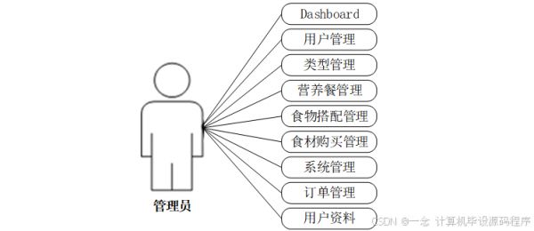 (1)管理员可以对用户管理、类型管理、营养餐管理、食物搭配管理、食材购买管理、系统管理、订单管理、用户资料等进行操作管理。其用例分析如图3-1所示。