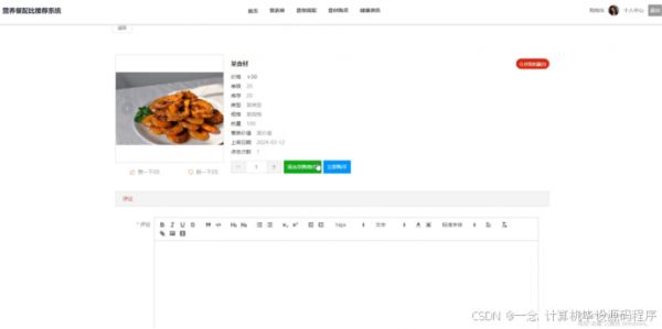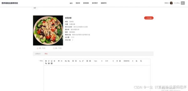 营养餐:在营养餐页面的输入栏中输入食物名称、热量、碳水化合物、蛋白质和脂肪进行查询,可以查看到营养餐详情,并根据需要进行收藏、赞一下、踩一下或评论操作;营养餐详细页面如图5-3所示: