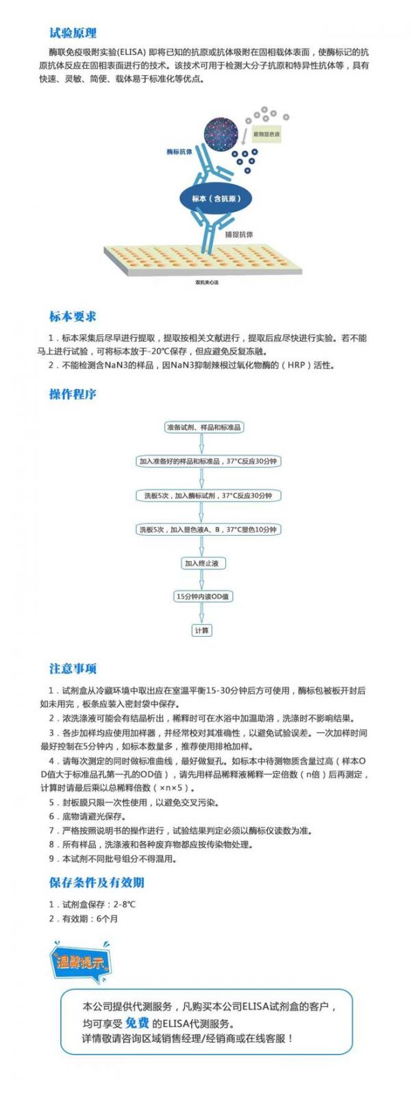 3.细胞培养物上清或其它生物标本:1000 x g离心20分钟,取上清即可检测,或将标本放于-20℃或-80℃保存,但应避免反复冻融。 (注:标本溶血会影响**检测结果,因此溶血标本不宜进行此项检测。)