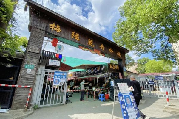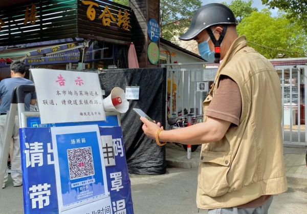 早上8点,陆续有不少市民们开始排队扫场所码,有序进入市场,开启一天“闲情逸致”的生活。对不会使用智能手机的老年顾客,工作人员还仔细查验相关纸质证明,做好人员信息登记。
