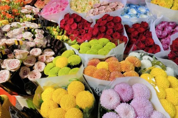 刚迈入梅陇花鸟市场,就会被摆放在店门口的大量鲜切花吸引,扑面而来的各种色彩,让人仿佛一脚踏入繁花似锦的美好。清新典雅的洋桔梗、花团锦簇的绣球,风姿绰约的芍药……这些当季盛开的鲜花迎风招展,浪漫风情尽显。“我们店早上四点就去进货,卖的都是当天新鲜的花。”一家花店的老板热情地招呼着顾客,若买上一束,她还会细心地告知你养护的小技巧。