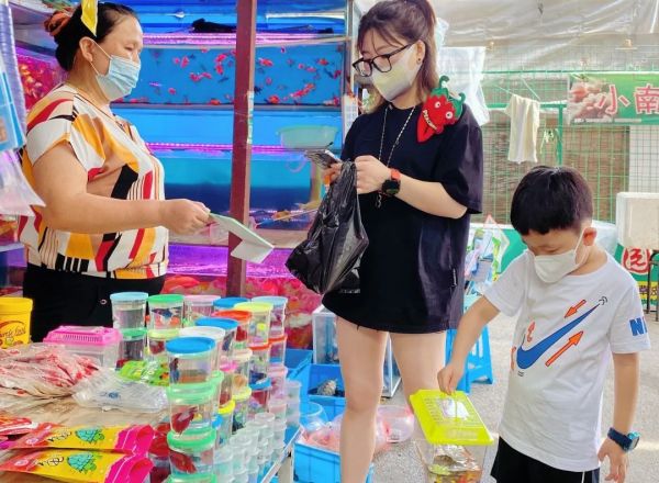 一位年轻的女士正带着孩子挑选小龟,她介绍道:“封控在家里的时候,觉得孩子太孤单了,就想着养只方便打理的小动物陪伴孩子。”而身旁的孩子正眨巴着眼睛,好奇地望着手中的小生命。