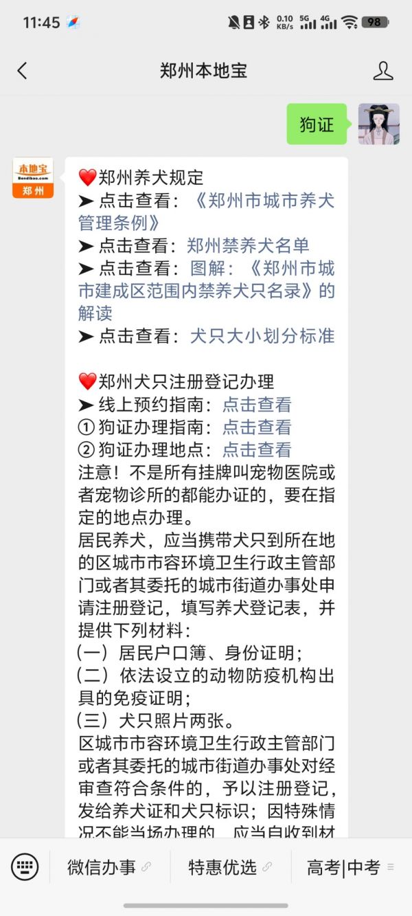 温馨提示:微信搜索公众号【郑州本地宝】,关注后回复【狗证】,可获取郑州狗证办理指南,包括养狗规定最新消息、城市养犬管理条例、禁养犬名单、郑州犬证网上办理、办理地点等(持续更新)