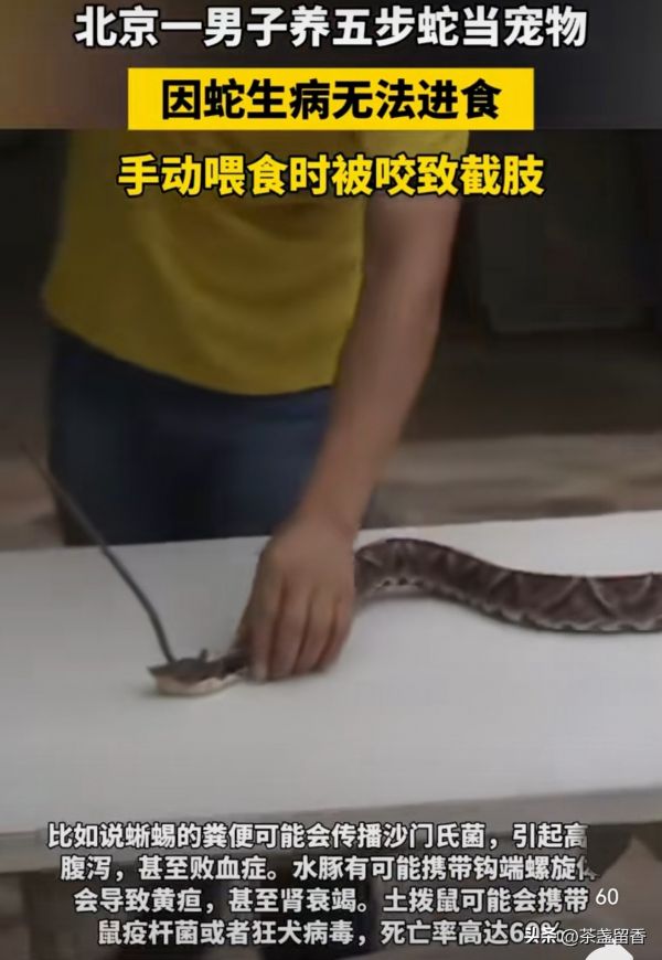 北京一名男子养蛇当宠物,手动喂食时被咬,最终截肢。