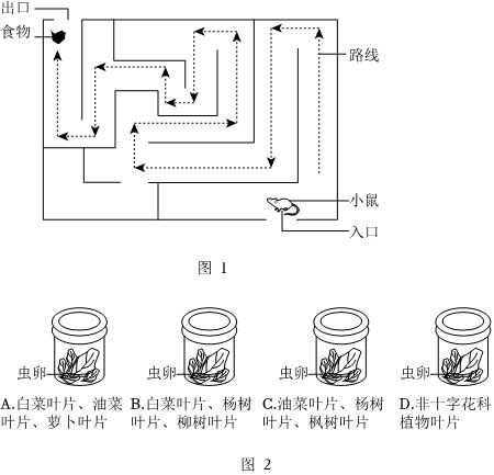 (一)在探究小鼠走迷宫获取食物的行为实验中,某组同学的设计方案如图1所示:在迷宫的出口处放一些小白鼠喜爱的食物,将小白鼠放进迷宫入口,记录小白鼠“尝试与错误”次数。据此回答: