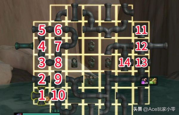 前往喧鸣深窟,坐标48.3, 48.8,在水池里有一个“被封住的入口”,点击就会打开一个水管连接页面。很简单的华容道小游戏,大家可以自己挑战一下。嫌麻烦的话可以按照下图中标注的数字,按顺序点过去就好了。连接完成旁边就会出现一个“位移的阻塞物”,点击打开即可。