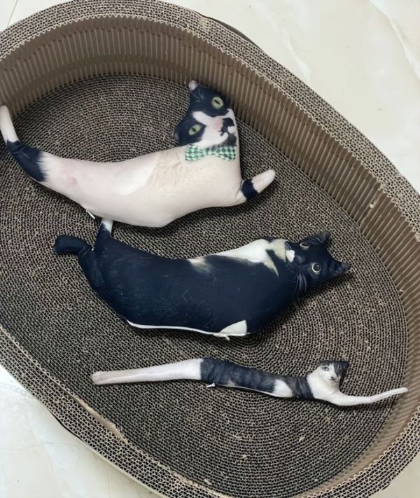 最令人惊讶的是,有主人竟然为同一只猫咪定制了三个不同姿势的“老鼠干”抱枕,摆在一起形成了系列作品,抽象程度层层递进。