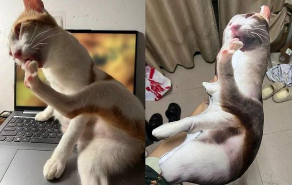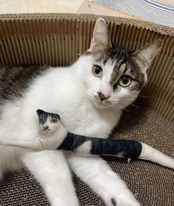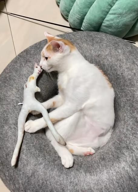 极少数猫咪似乎能认出这是自己的形象,表现得异常兴奋,躺在“老鼠干”旁边摆出相同姿势,上演一场“本体与分身的对话”。