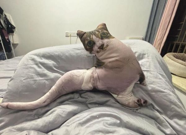 伸着大长腿的猫咪照片被商家做成了干瘪的“老鼠干”抱枕,猫咪本尊看到后一脸愁容,仿佛在说:“这不可能是我!”