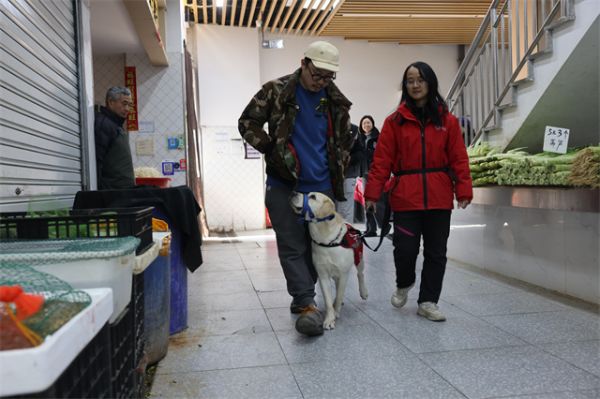 为了考察辅助犬在不同场景的运用,考试的地点放在菜市场等地。当舒也、舒而、吉尔在孤独症孩子家长的牵引下齐刷刷经过小区时,受到宠物犬们的“围观”,面对小狗们的热烈“示好”,辅助犬目不斜视,强大的气场抵挡住了“诱惑”。