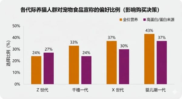 这一趋势在养狗人群中同样存在。选择 “全价营养”的比例从 Z 世代的19% 递增至婴儿潮一代的 47%;选择“高蛋白/蛋白来源”**的比例则分布在 22%(Z 世代)到 39%(X 世代)之间。