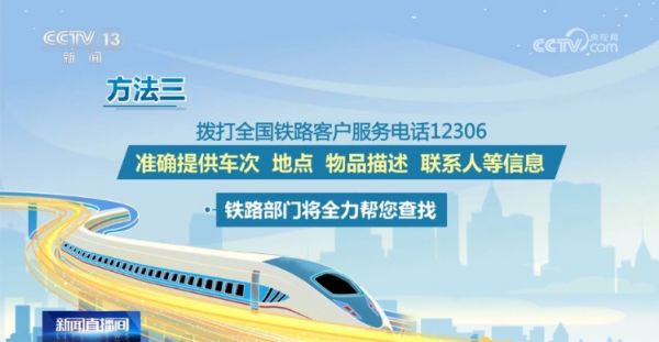 方法三:拨打全国铁路客户服务电话12306,准确提供车次、地点、物品描述、联系人等信息,铁路部门将全力帮您查找。