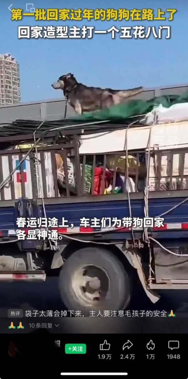 近日,多地出现带宠物回家过年时,主人把狗挂在车尾或放在车顶的视频,配上温馨或搞笑的音乐,称“再远也要带你回家”。其实这种行为不仅十分危险,还违反交通法规!上游新闻对话重庆交警,直击安全隐患,并为大家送上带宠出行指南。