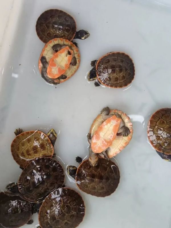 幼体性格温顺胆小,橘红色腹甲像穿了小肚兜,颜值很高。水性好,可与鱼混养,苗子价格30-40元。