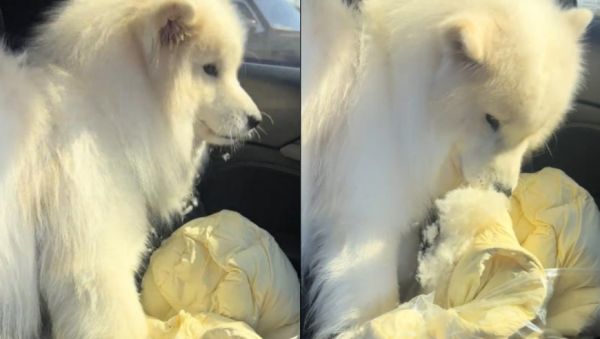 女子高速上一扭头,发现狗子把羽绒服撕了,开窗吸羽毛车内秒变雪景