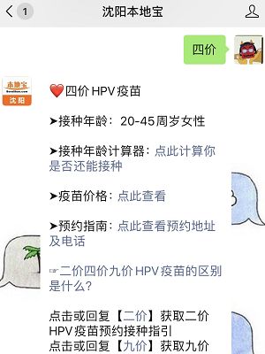 温馨提示:微信搜索公众号【沈阳本地宝】,关注后在对话框回复【四价】可获沈阳四价hpv疫苗接种年龄计算器、参考价格、预约指南及接种知识科普等信息。