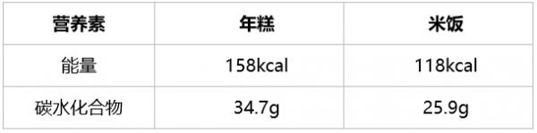 根据《中国居民膳食指南》建议,我们每天摄入的谷薯类250~400g。年糕经过挤压加工,体积小、密度高,同样一小碗,年糕的热量和碳水化合物含量远高于米饭。