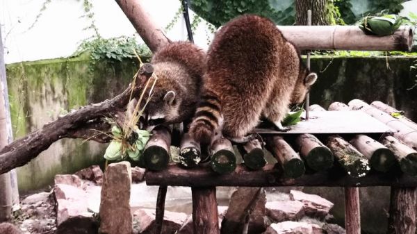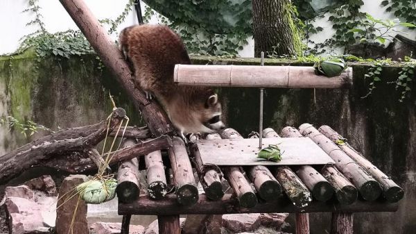 第一批“食客”是4只浣熊。等放下粽子的饲养员离开后,它们才“鸡贼”地从高处溜下来,老练地掰开表皮,用小爪子一点点掏出馅料。
