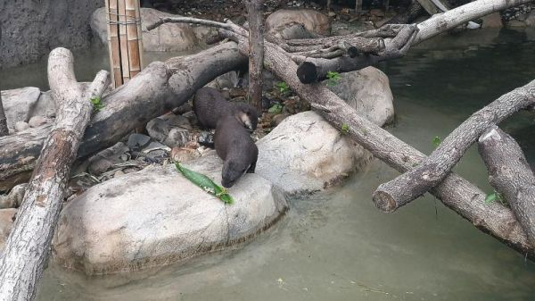 第二批“食客”是8只水獭。和慵懒的浣熊不同,小家伙们望见饲养员在展馆外提着塑料桶,便一溜烟地跑到门边候着。心急的,直接扑向塑料桶,半个身子都探了进去。
