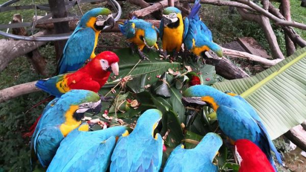 对于粽子的馅料,金刚鹦鹉也不挑剔,照单全收,除了水果,还有花生。估计是吃舒服了,一些金刚鹦鹉还主动打扫起了餐桌,把芭蕉叶叼离底盘。