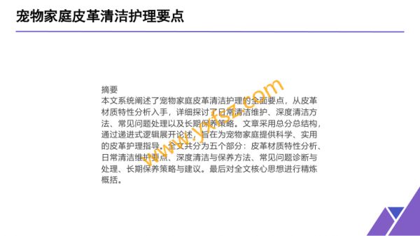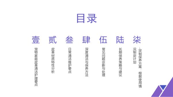 5.干燥定型自然风清洁表面和缝隙革滋养霜补充油脂干或低温烘干3皮革滋养与保护A CE-干燥时间确保-选择成分含天完全吸收前不接触然油脂和保湿剂宠物滋养护理要点-涂抹方法薄层-效果周期通常均匀涂抹,避免堆可维持1-2个月积B D4特殊部位处理针对宠物频繁接触-爪子接触区加12部位强耐磨保护-下颌摩擦区使-耳部周围注意34用防磨损剂防过敏配方选择-腿部长毛区定5期清理毛发嵌塞05常见问题诊断与处理O NE1污渍类型与处理常见污渍类型及处理-毛发嵌塞使用专用0106方法除毛剂软化清除-食物污渍立即用微-口水渍定期使用消0205湿布擦拭,避免干固毒清洁剂-尿液渍使用酶基除-粪便污染先刮除固0304渍剂彻底清洁体,再用专用清洁剂2皮革损伤修复12-小面积磨损使用皮革修补不同类型损伤的处理剂34-染色处理使用去色剂谨慎-裂痕修复使用专用填缝剂处理56-开胶修复重新涂抹皮革专-异响处理调整或更换内部用胶水支撑结构3宠物过敏处理01针对宠物皮肤过敏02-更换清洁剂使用无香料配方03-隔离处理暂时限制宠物接触区域04-环境消毒使用宠物专用消毒液05-兽医咨询严重情况及时就医06-防过敏喷雾定期使用防护性喷雾4异味控制方法01控制皮革异味的策略02-定期深度清洁彻底清除细菌滋生环境03-活性炭包放置在皮革附04-宠物除臭剂使用宠物专近吸收异味用除臭喷雾05-通风干燥保持环境良好06-定期消毒使用宠物安全流通消毒剂06长期保养策略与建议O NE1保养周期规划12-日常维护每天快速检查科学的保养周期和除尘34-周度清洁对表面污渍进-月度深度清洁全面清洁行局部处理和滋养56-季度检查评估损伤情况-年度评估全面保养和改并修复造计划2环境因素控制优化存放和使用的环境0106-防尘措施使用防尘罩-湿度控制保持在40%-02或罩子60%的相对湿度05-通风要求保持适当空-温度管理避免极端高气流通03温或低温环境04-光照防护减少直接阳光照射3宠物行为管理改善宠物使用-提供替代品-训练引导-限制使用-定期轮换-奖励引导习惯准备安全的咬训练宠物避免对幼宠使用时避免同一部位正向激励使用胶或磨牙玩具啃咬家具加强看管过度使用指定磨牙点4专业维护建议定期寻求专业帮助-每年一次全面检查由专业皮革护理师评估010302-半年一次专业清洁使用工业级设备07定制保养方案根据使用情况制-定计划O NE-定制保养方案根据使用情况制定计划-紧急处理服务建立快速响应机制-预防性护理定期使用防护性产品总结本文系统探讨了宠物家庭皮革清洁护理的全面要点,从皮革材质特性分析入手,详细阐述了日常清洁维护、深度清洁保养、常见问题处理以及长期保养策略核心要点可以概括为了解不同皮革特性、坚持科学清洁流程、注重日常维护细节、及时处理常见问题、制定长期保养计划通过系统性的护理方法,可以显著延长皮革制品的使用寿命,保持其美观和功能在未来的实践中,应根据具体使用环境和宠物行为特点,灵活调整护理方案,实现最佳的保养效果皮革护理不仅关乎物品本身,更体现了对宠物的关爱和对家居环境的维护,是宠物家庭日常管理的重要组成部分谢谢。
