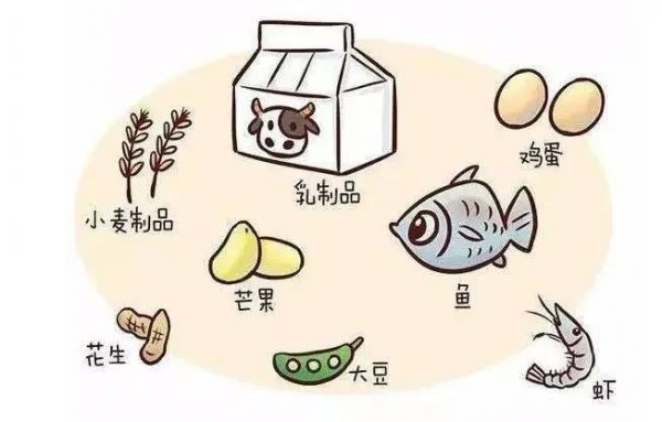 食入式过敏原:如牛奶、鱼虾、牛羊肉、蔬菜、水果等;