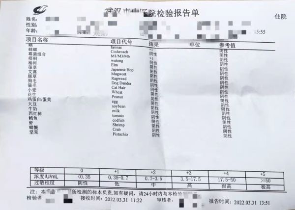 在武汉市中医医院进行了过敏原筛查20项(食入+吸入)检查后,结果显示小轩对尘螨过敏+4。
