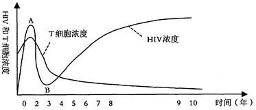 艾滋病(AIDS)是目前威胁人类生命的重要疾病之一。能导致艾滋病的HIV病毒是一种球形的RNA病毒。HIV最初侵入人体时,人的免疫系统可以摧毁大多数病毒,接着少数HIV在体内潜伏下来,经过2~10年的潜伏期,发展为艾滋病(如图所示)。请回答:(每空2分,共10分)
