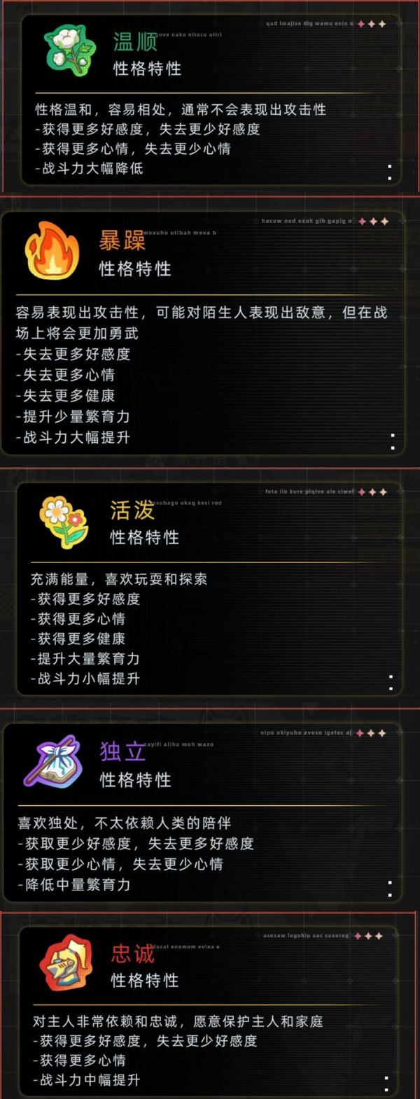 宠物拥有特性会影响其价格及养护开销,最多可具备四项,部分宠物天生自带。经济类包括价值连城(售价更高)和小饭量(日常花费减少);生活类有长寿(寿命延长)、变异(后代更易变异但自身寿命缩短)及报恩(随机赠送礼物);社交类则含可爱(抚摸提升更多心情)与高效消化(进食效果增强)。