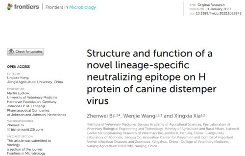 近年来,宠物产业发展迅速,宠物疾病的关注度不断提高。兽医所于2021年成立宠物疾病防控创新团队,主要开展宠物重要疾病研究及防治技术和产品的研发。犬瘟热是危害宠物犬的重要疫病之一。随着犬瘟热病毒的不断变异,出现了抗原性改变、免疫逃逸和宿主范围扩大等特点。兽医所宠物团队在犬瘟热病毒抗原变异和抗体中和机制方面取得进展,研究论文“Structure and function of a novel lineage-specific neutralizing epitope on H protein of canine distemper virus”,近日在国际学术期刊“Frontiers in Microbiology” (中科院二区Top期刊,影响因子6.024)在线发表。