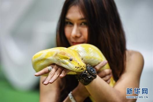 11月19日,在泰国曼谷蒙通他尼会展中心,一名参观者在宠物展上与一条蟒蛇合影。当日,由泰国宠物行业联合会主办的“宠物奇境”宠物展在曼谷开幕。本次宠物展为期四天,吸引了200多家宠物行业机构参展,观众在展会上可以与100多种宠物近距离接触。据泰国宠物行业联合会预测,2016年泰国宠物行业可以实现10%以上的增长。新华社记者李芒茫摄