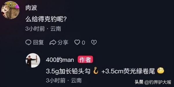这位钓鱼老哥表示,自己所用的钓具是一枚3.5g的加长铅头钩,外加一条3.5cm荧光绿卷尾,没想到半个多小时就把这条鳄雀鳝钓了上来。