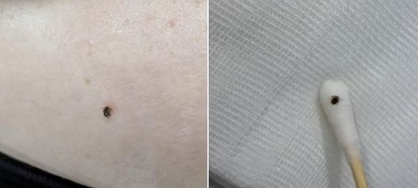 医生检查后发现,张女士肚皮上的小黑点竟是一只牢牢吸附在皮肤上的蜱虫。相应处理后,医生小心翼翼的用镊子取出了蜱虫并消毒,张女士并无大碍。