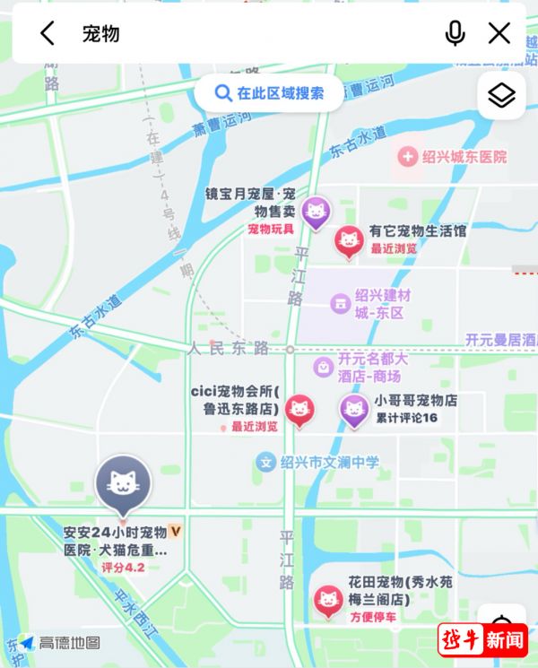 打开手机地图,仅绍兴越城区城东平江路一带,就密集分布着五、六家宠物店或宠物服务店。