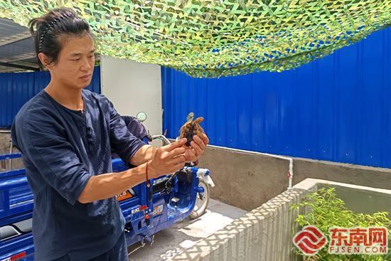 张一帆借助直播拓宽宠物龟的销售渠道东南网漳州6月6日讯(本网记者 沈文栋 通讯员 高琼 文/图)五月的清晨,在山间清风的吹拂下,诏安红星乡下河社区的宠物龟养殖场负责人张一帆,开始了自己忙碌的一天。养殖宠物龟以来,每天蹲在养殖池边,为养殖场数十只宠物龟送去“早餐”,成为他日复一日的工作之一。