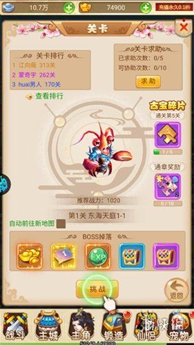 从第1关东海天庭开始,稳步推进主线关卡,获取经验、金币和装备,解锁更多玩法。