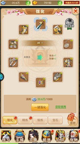 优先强化武器和防具,利用“一键强化”功能快速提升属性,前期消耗的银两可通过关卡挑战轻松获取。