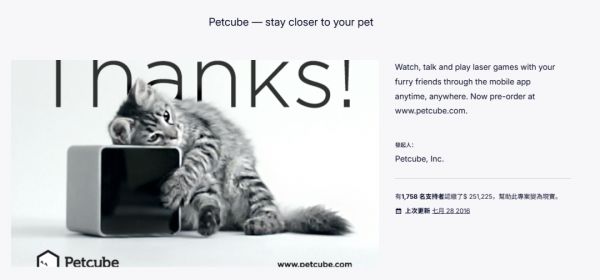 2016年Petcube在Kickstarter推出立方体宠物助手,配备扬声器、麦克风、摄像头、Wi-Fi 和激光指示器,通过APP远程交互。作为当时宠物护理领域少见的科技产品,该项目最终以25.1万美元创下宠物类众筹纪录,验证了市场对“交互式监控”的强烈需求。
