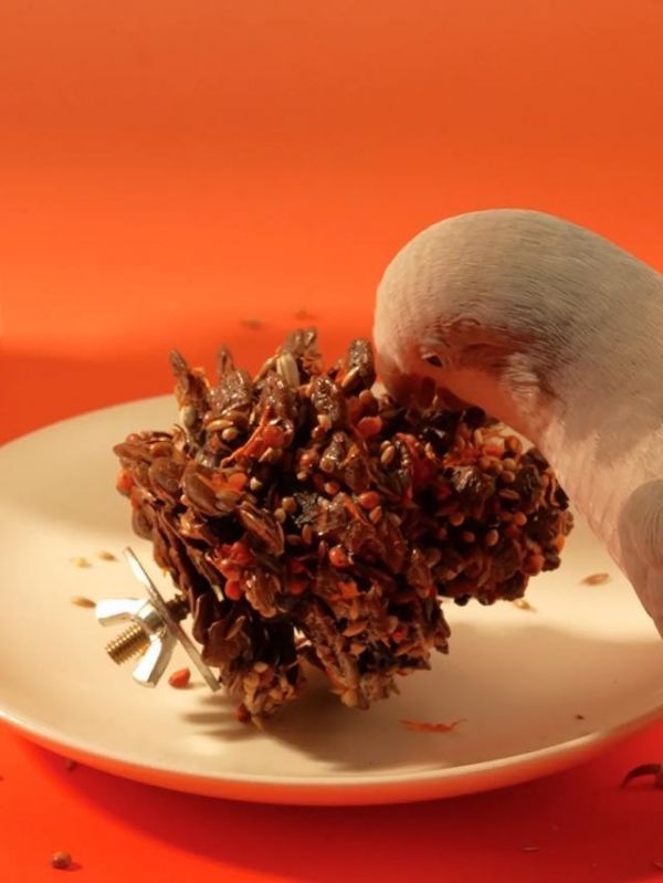 决定以鹦鹉食品入手后,她在家里花了两三周时间研发配方,然后利用自己工业设计的专业背景,用3D打印机开模,专门制作了尺寸正好能让鹦鹉嘴巴叼住的小模具。她用谷物、蔬菜粉等健康食材,做出了一个具有“下午茶仪式感”的甜甜圈,并拍下视频发布。