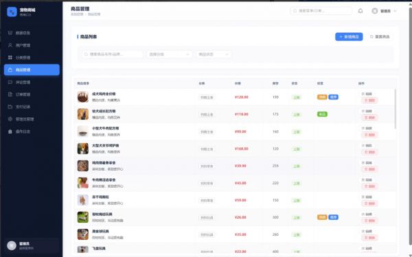 基于上述背景,本课题拟设计并实现一个基于Python+Flask的宠物用品商城系统。系统将集成用户管理、商品展示、购物车、订单处理、在线支付等核心电商功能,同时引入协同过滤推荐算法,通过分析用户浏览、收藏、购买等行为数据,构建用户兴趣模型,实现个性化商品推荐。系统将重点关注宠物消费的特殊场景需求,探索垂直电商领域的智能化转型路径,为宠物主提供更精准、便捷的购物体验,也为宠物用品行业的数字化升级提供技术参考。这一研究不仅是对电商系统开发技术的综合实践,更将推动宠物消费与智能技术的深度融合,具有重要的理论研究价值与广阔的应用前景。