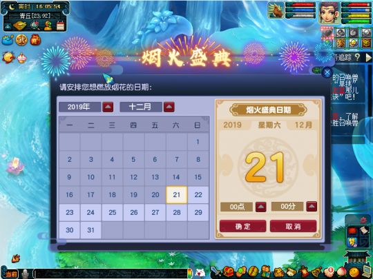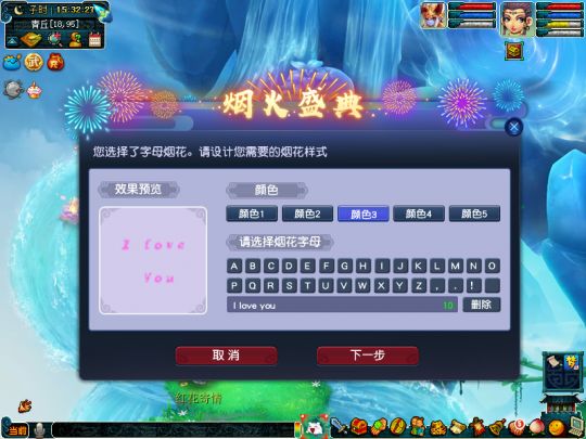 可以定制一发自己想要的烟花(可以用字母拼出自己心上人的名字哦),并且选择此烟花出现的时间段。届时,玩家自定的烟花就会在青丘月镜湖燃放,并且赠送一条传音。