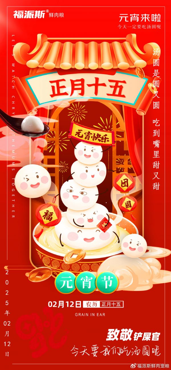 元宵佳节,温馨洋溢,传统韵味浓厚。福派斯鲜肉宠粮满载祝福与爱意,向宠物家长及活泼可爱的毛孩子献上节日的问候。在这团圆时刻,让我们共享人宠同欢的温情与喜悦,为家中的小成员也准备一份专属惊喜。