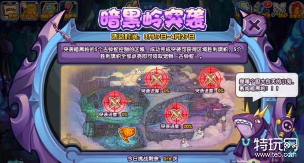 1、活动有五个突袭点,大家点击活动界面的突袭地点和BOSS战斗,根据BOSS血量战胜后会给不同的百分比进度。当5个地点进度全部达到100%就可以领取一只:古钟蛇
