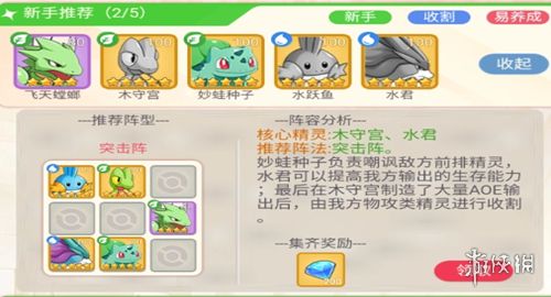 推荐使用突击阵。妙蛙种子负责嘲讽敌方前排精灵,水君则增强我方输出精灵的生存能力。木守宫造成大量范围性伤害(AOE)后,我方物攻型精灵进行最后的收割。
