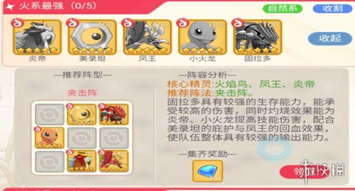 推荐采用夹击阵。固拉多拥有出色的生存能力,可以承受大量伤害,其灼烧效果还能提升炎帝与小火龙的技能伤害。搭配美录坦的庇护技能和凤王的回血机制,整个队伍的输出能力将得到显著提升。