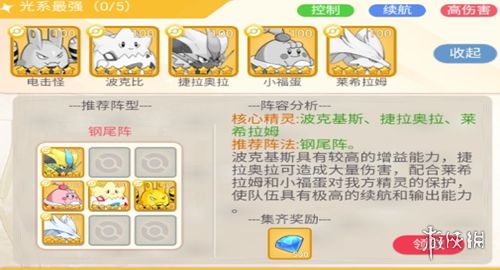 推荐阵法为钢尾阵。波克基斯具备优秀的增益能力,捷拉奥拉能造成可观的伤害输出。再加上莱希拉姆与小福蛋对我方精灵的保护作用,这支队伍将同时拥有强大的续航能力和输出能力。