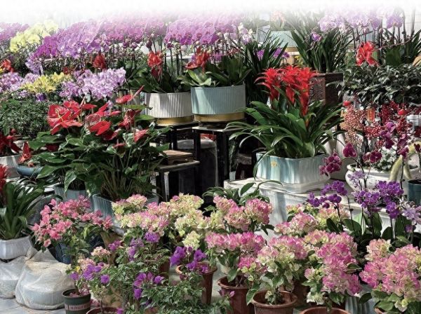 来到花卉市场,入口处最显眼的铺位属于王小丽,她的摊位上层层叠叠,宛如色彩瀑布。此刻,她正麻利地为一位老顾客挑选的长寿花修剪残叶。“像这长寿花、蝴蝶兰、‘鸿运当头’、红掌——这几天就数这些开花的卖得好,一天能走三十多盆。”她指着几盆标价在200到400元之间的精品说,“这个价位的最受欢迎,美观大方,摆在家里也大气。”