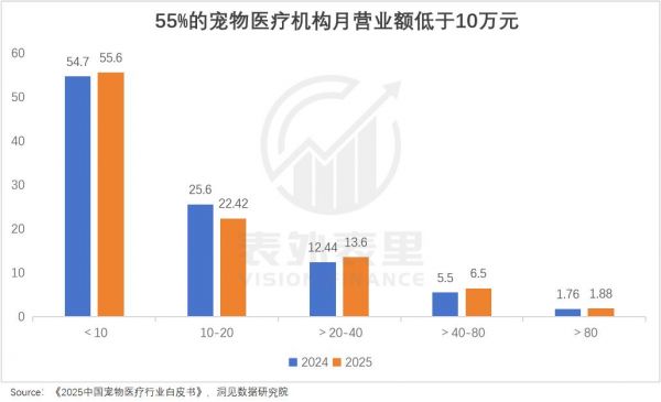 量价齐齐承压,门店却越开越密,宠物医院便陷入了“痛苦螺旋”:一边,是宠物主纷纷抱怨“猫狗看病比人贵”;另一边,是收入增长缓慢,55%的机构月营业额低于10万元。